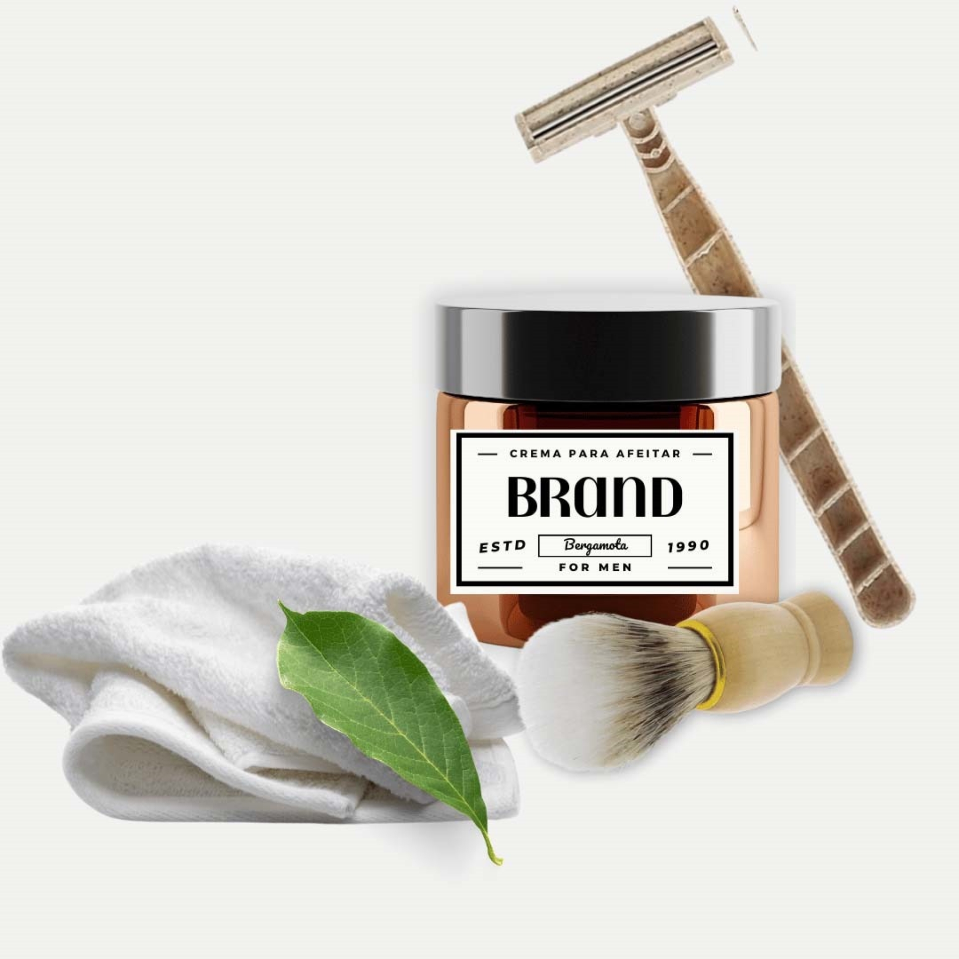 Kit para afeitado, incluye crema para afeitar, brocha aplicador de madera y cerdas naturales, toalla facial y restillo de fibra de trigo, en presentación de tubo de cartón de 12.50 a 14.50 con tapa metálica