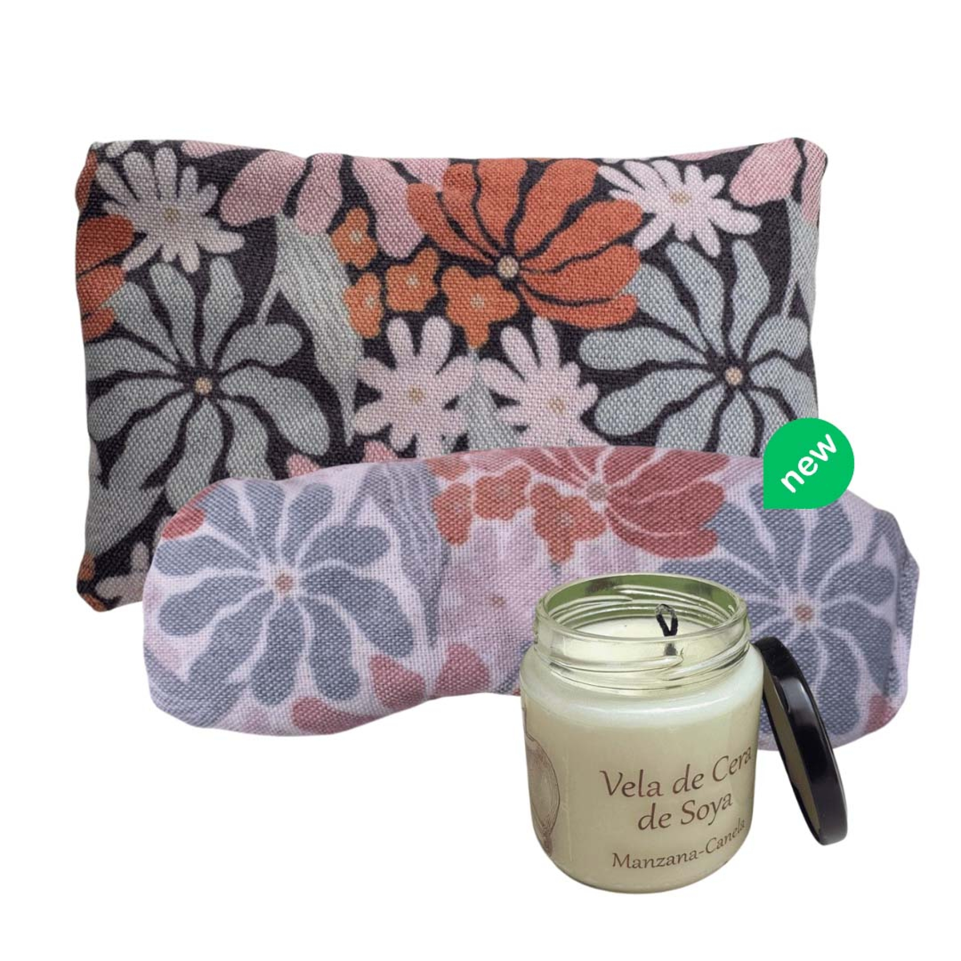 Set de relajamiento y aromaterapia, incluye almohada de semillas con esencia de medida 20.00 x 8.00 y antifaz elaborados en tela de Rpet, y vela de cera de soya aromática en frasco con tapa de 30 gramos. No incluye personalización.