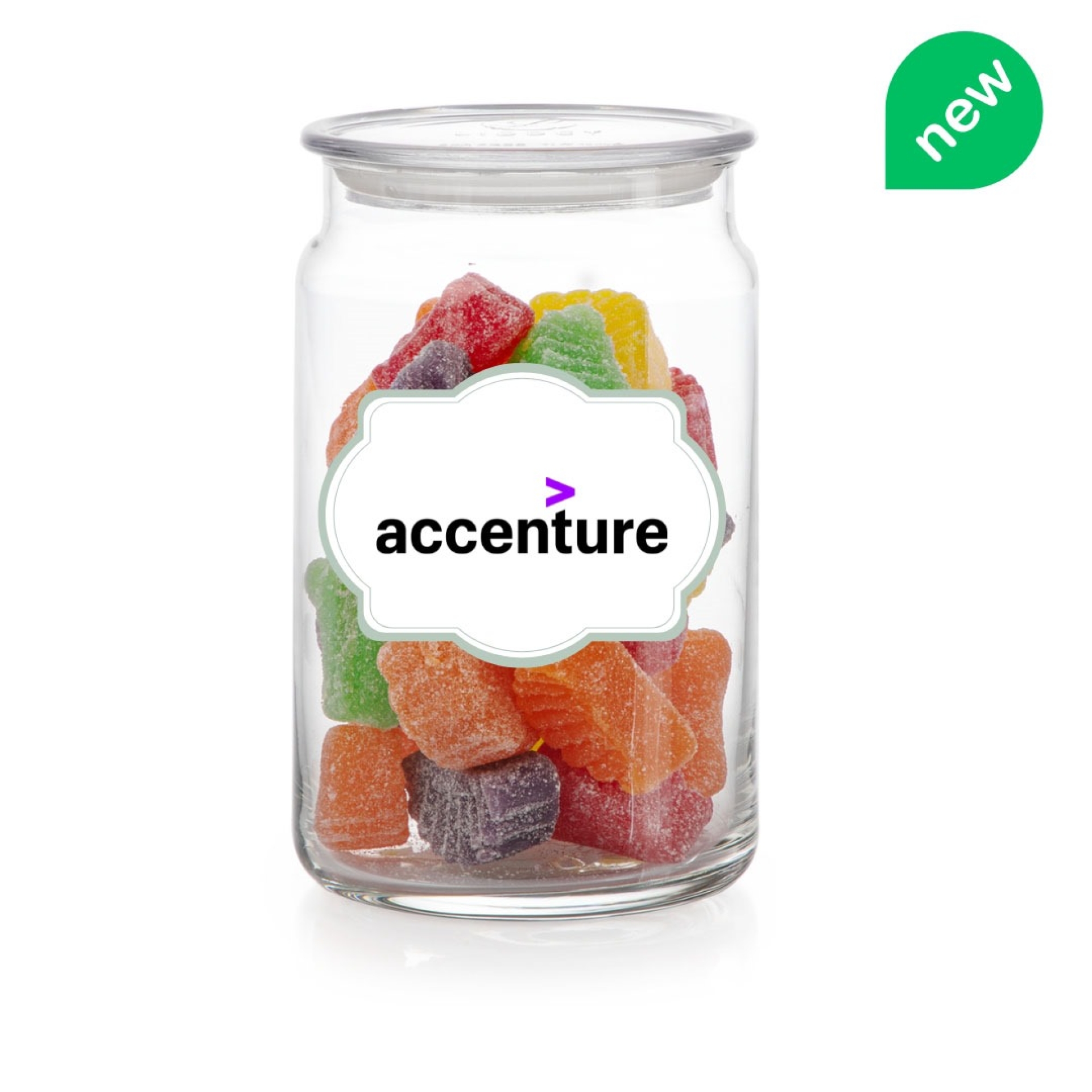 Dulcero de escritorio de 750 ml de vidrio con tapa hermetica con gomitas variadas. No incluye personalizacion