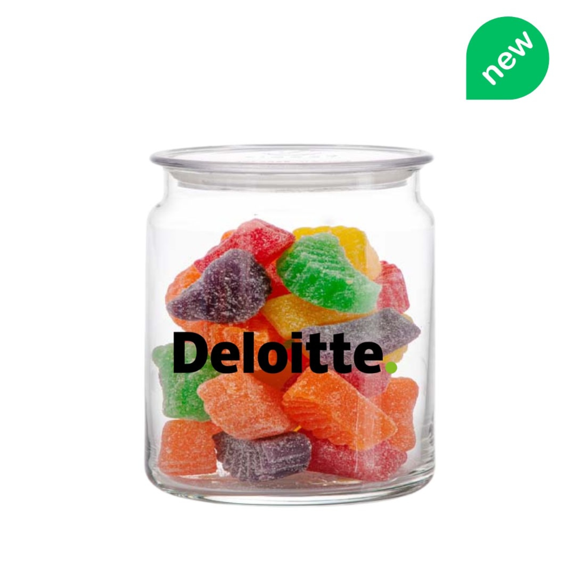 Dulcero de escritorio de 500 ml de vidrio con tapa hermetica con gomitas variadas. No incluye personalizacion