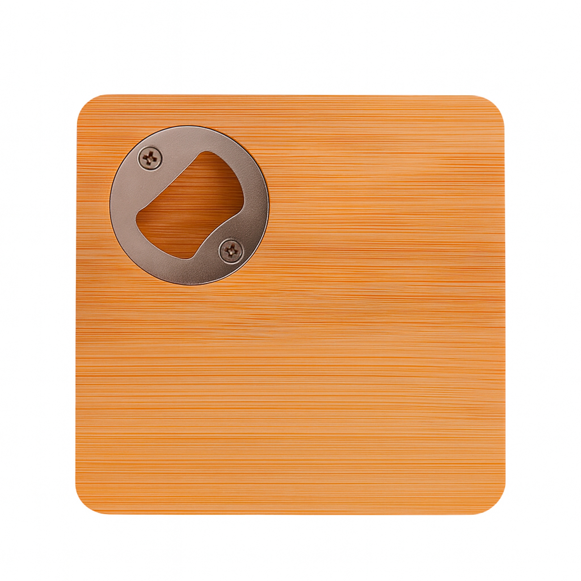 Destapador y portavasos de bambú con diseño cuadrado. De medidas 9.80 x 10.00 cms
