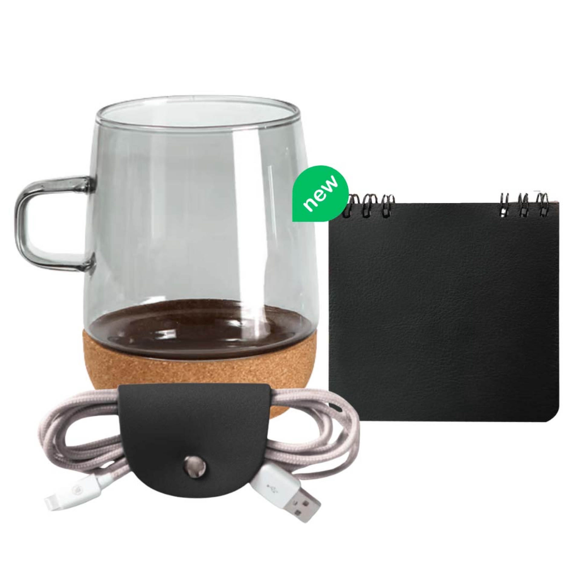 Kit escritorio , incluye taza de vidrio corcho, mini libreta de papel reciclado y porta audífonos elaborados en piel de nopal. En presentación de caja de cartón. No incluye impresión.