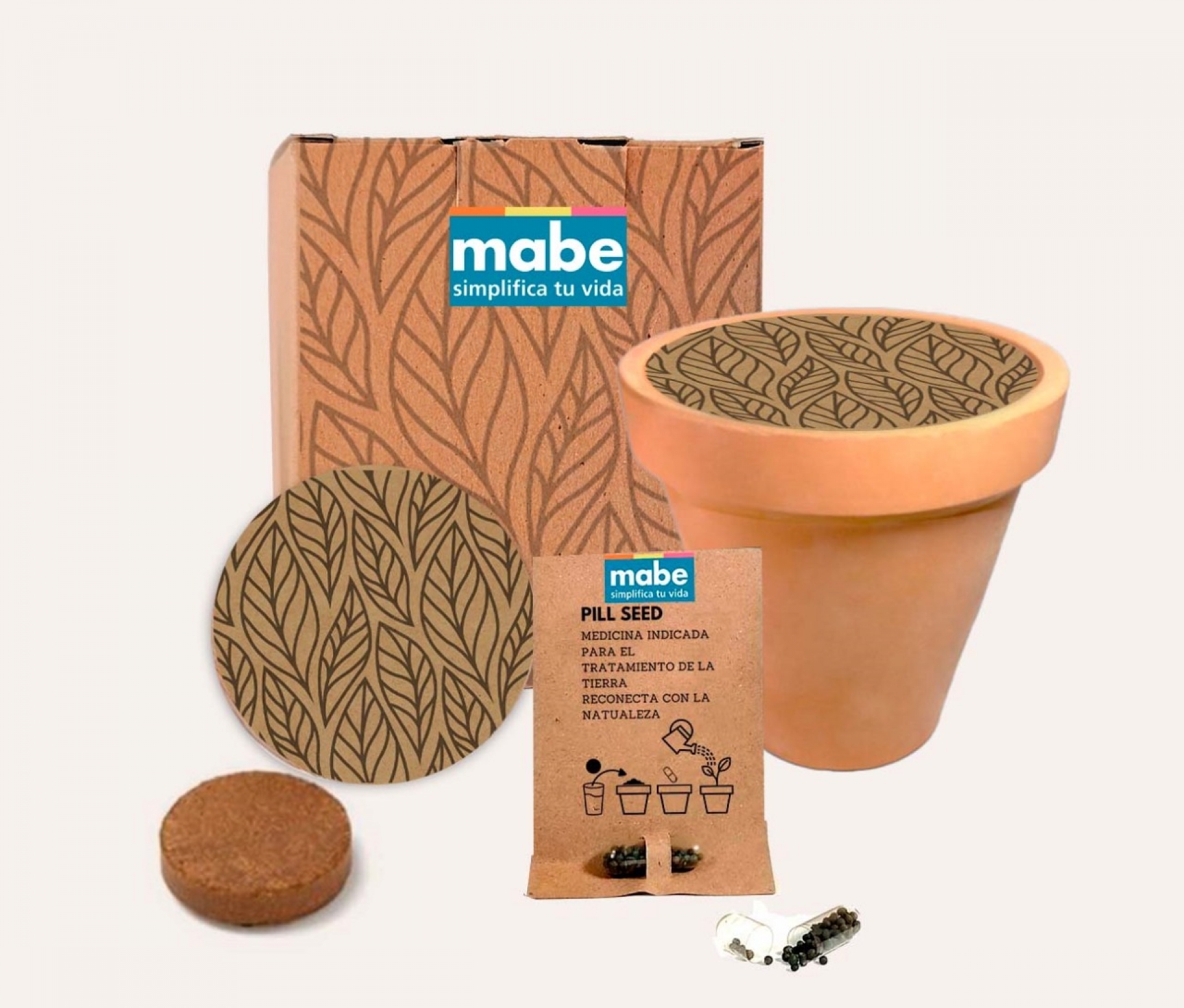 Kit de germinado que incluye maceta de barro, pastilla de tierra comprimida, capsula con semillas a elegir, porta maceta de mdf, en presentación de caja de cartón. No incluye personalización.