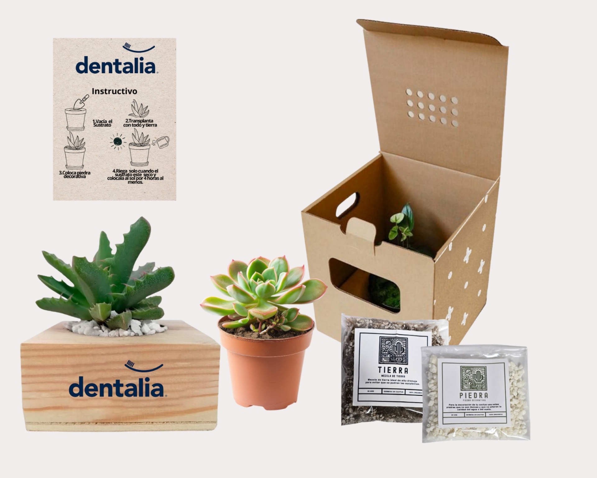 Maceta wood 10x10x5 cm elaborada en madera, con suculenta viva, tierra y piedra decorativa con instructivo en caja tipo jaula de alta protección. No incluye personalización.