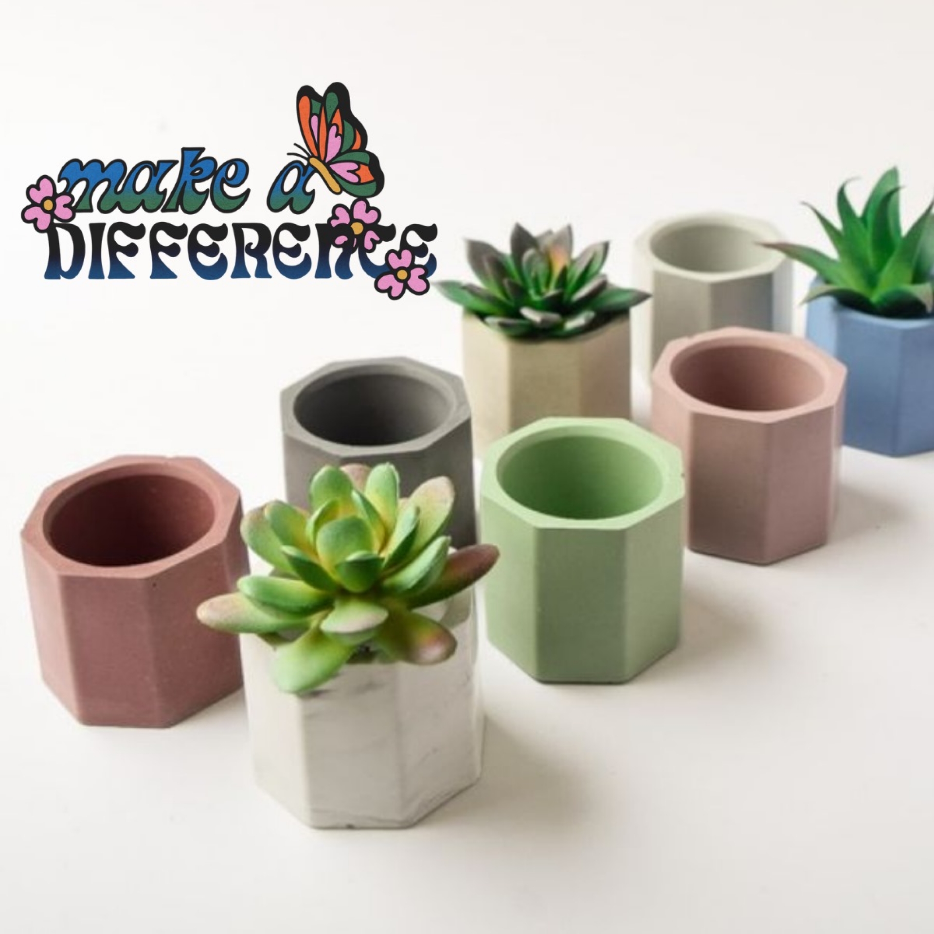 Maceta elaborada en concreto con color de medidas 5.5 cms de ancho y 4.50 cms de altura con planta suculenta viva en presentación de caja.