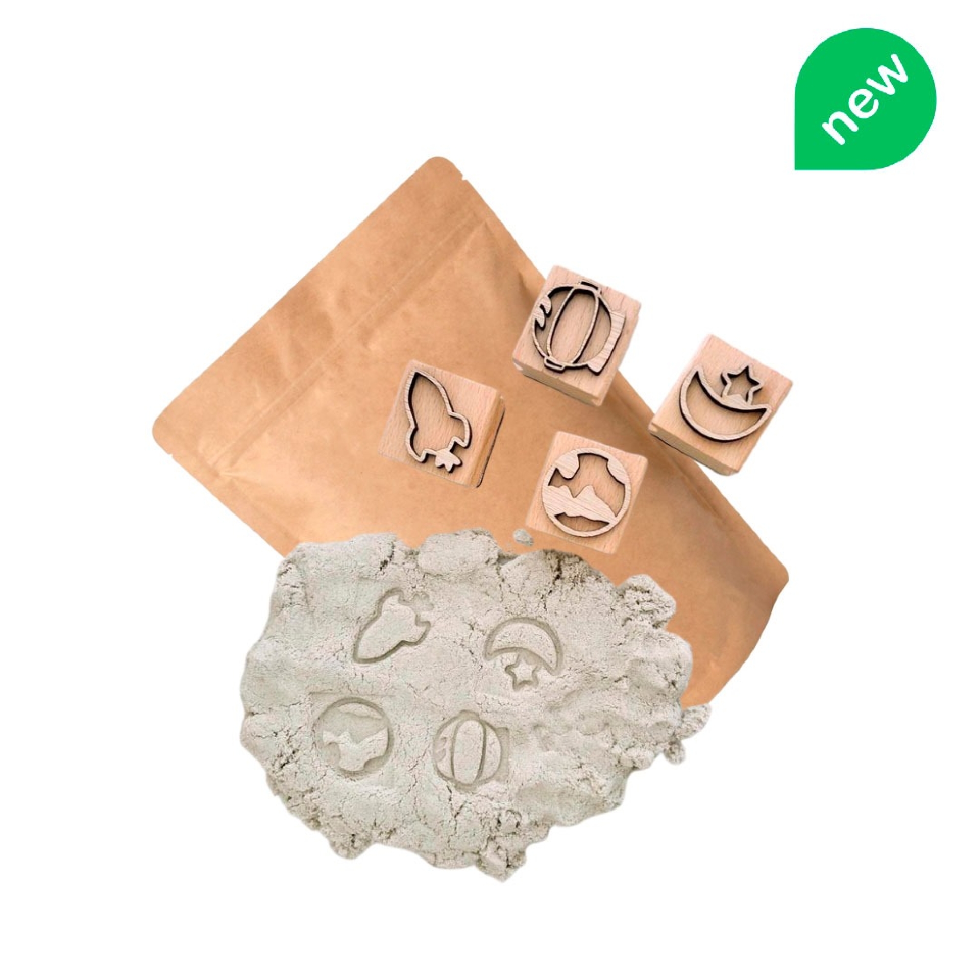 Juego de 4 sellos mini con cuatro figuras diferentes elaborados en MDF, con arena kinetica didáctica, en presentación de sobre kraft con cierre.