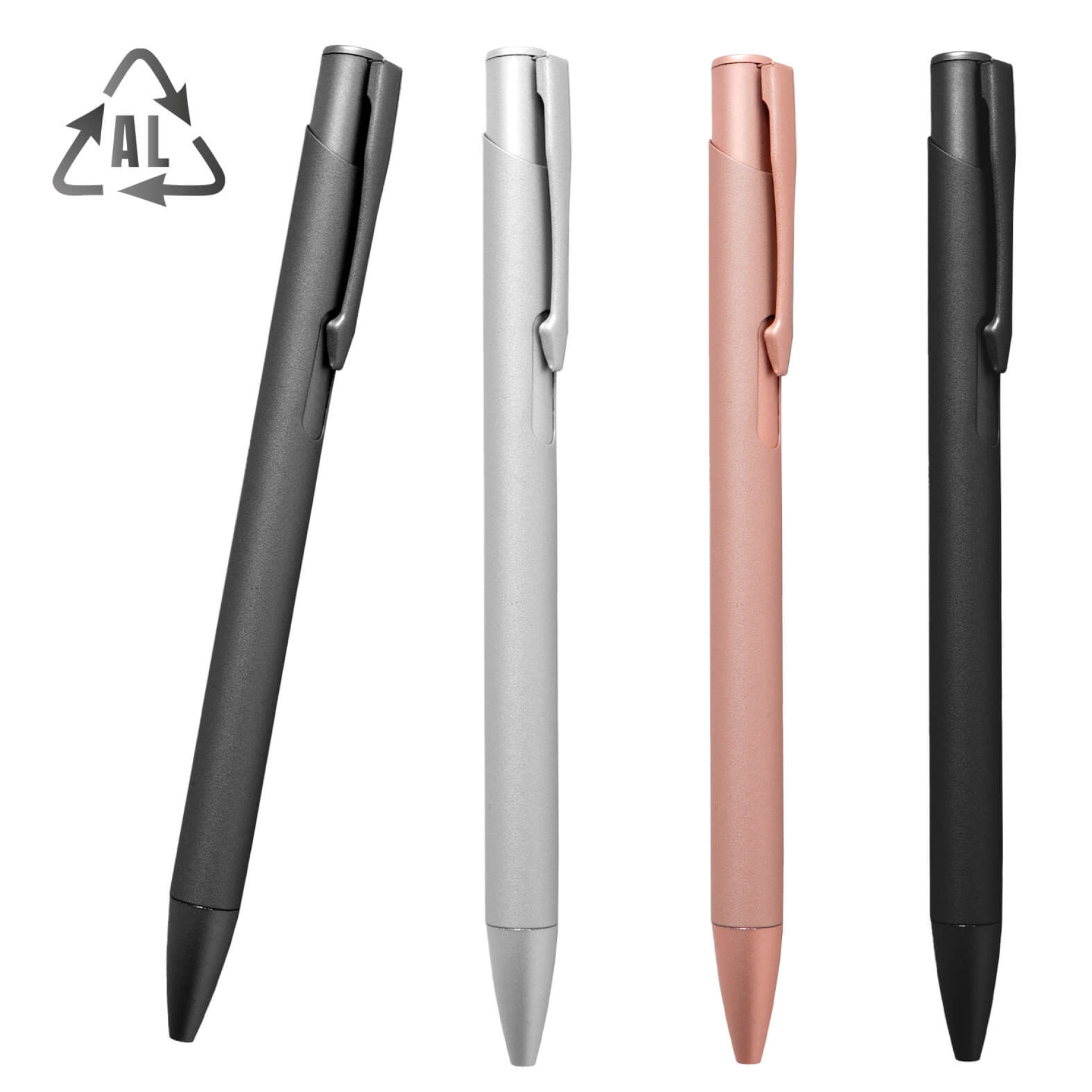 Bolígrafo ecológico fabricado con aluminio reciclado. Cuenta con mecanismo de click y un clip integrado para mayor practicidad. Medidas 13.70 x 1.00 cms