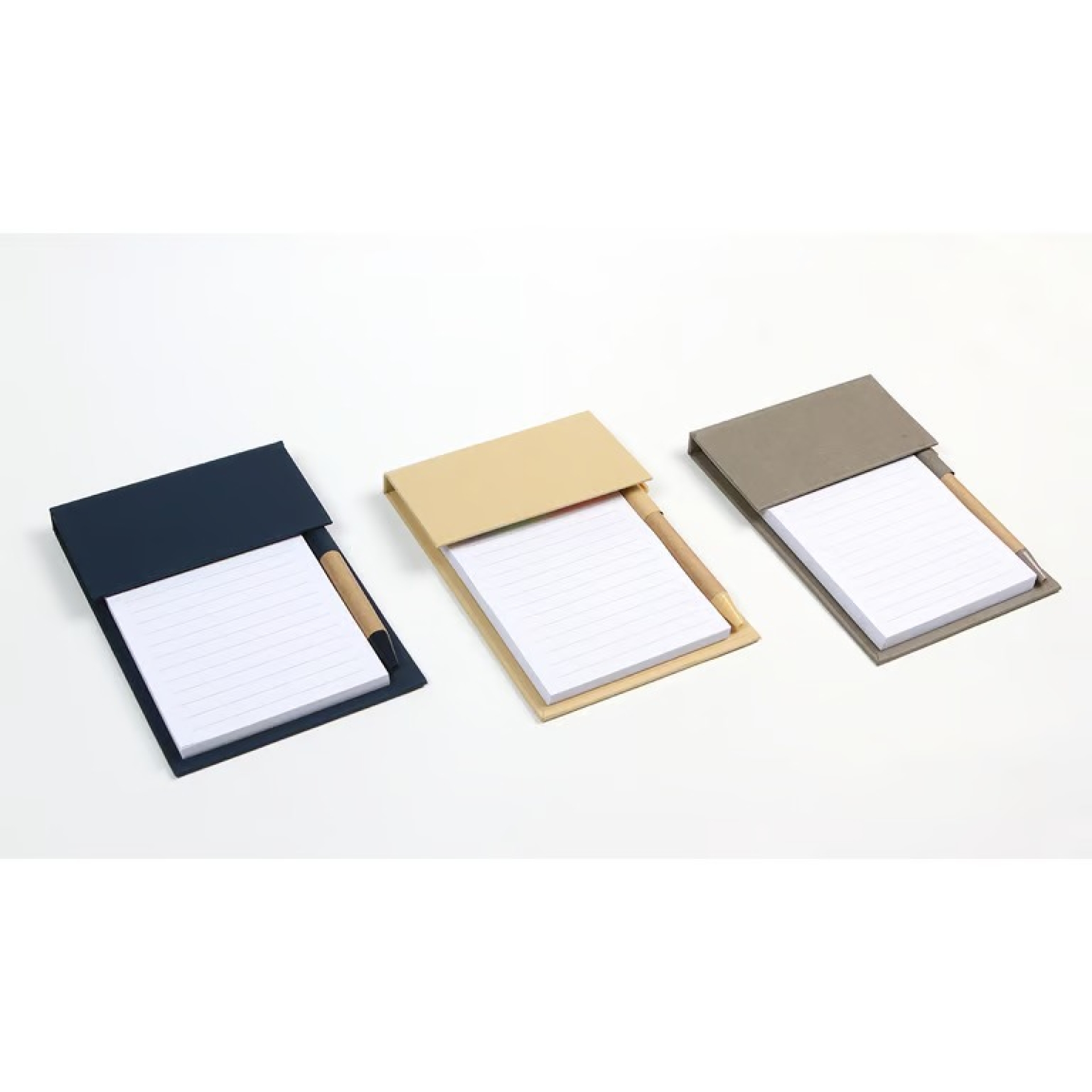 Pad ecológico con notas para recordatorios, notas adhesivas y bolígrafo tinta negra. Fabricado en material ecológico. Medidas 11.00 X 15.80 cms.